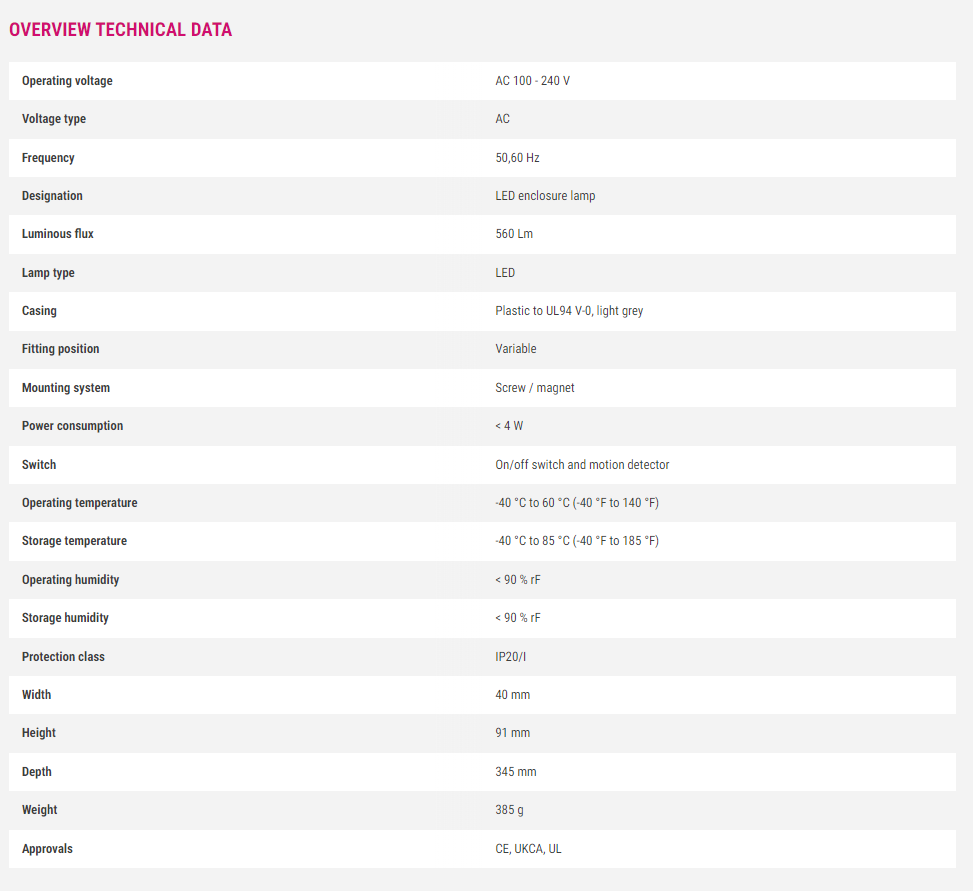 Applies to: The flat slimline LED light SL 025 with on/off switch and motion detector is ideal for use in cabinets and casings with electrical/electronic components with a high component density. It can be fixed on the narrow or wide side with screws, or with magnet fixing at any desired position in steel cabinets without any installation effort. Thanks to its integrated socket, the SL025 enables the operation of additional electrical devices. The integrated motion detector also replaces a door switch.